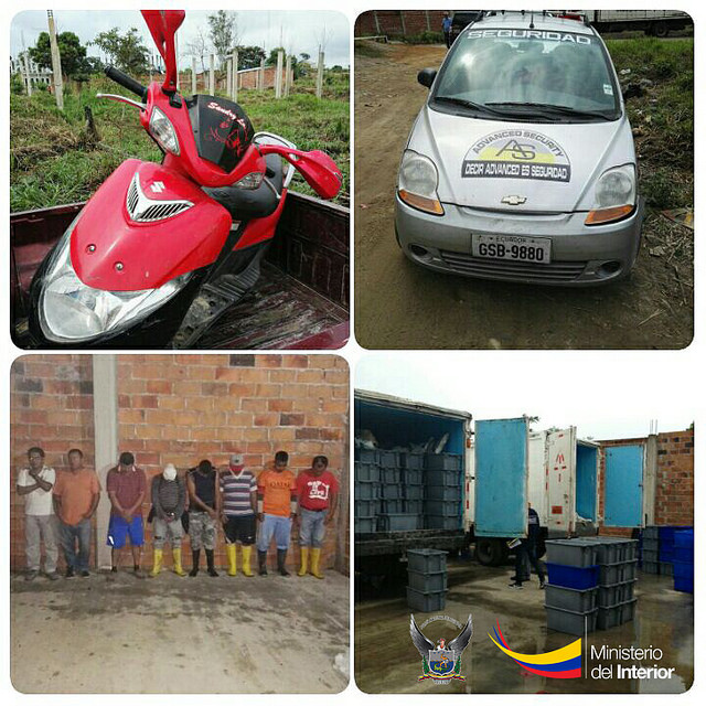 En este lugar, varios sujetos descargaron 369 gavetas que contenían 17.08 kilos de camarón. Los uniformados ingresaron y arrestaron a ocho personas, que se encontraban cometiendo el presunto delito, uno de ellos tenía una boleta de captura por un presunto delito de asesinato en la provincia de El Oro.
