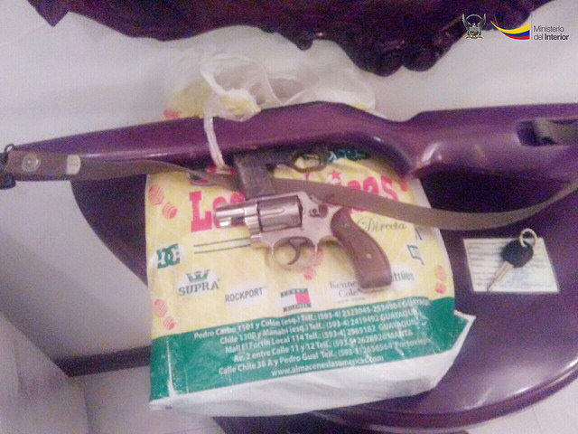 En uno de los domicilios fueron hallados cuatro de estos paquetes que estaban envueltos con cinta adhesiva color café y en su parte posterior un logotipo representado con tres letras A. El peso de la droga es de 4,5 kilos. También se encontró una carabina marca Erma Werke, calibre 1.22 y un revolver Smith Wesson, calibre 38. Mientras que en la otra vivienda se halló una pistola Smith Wesson, calibre 9 mm.