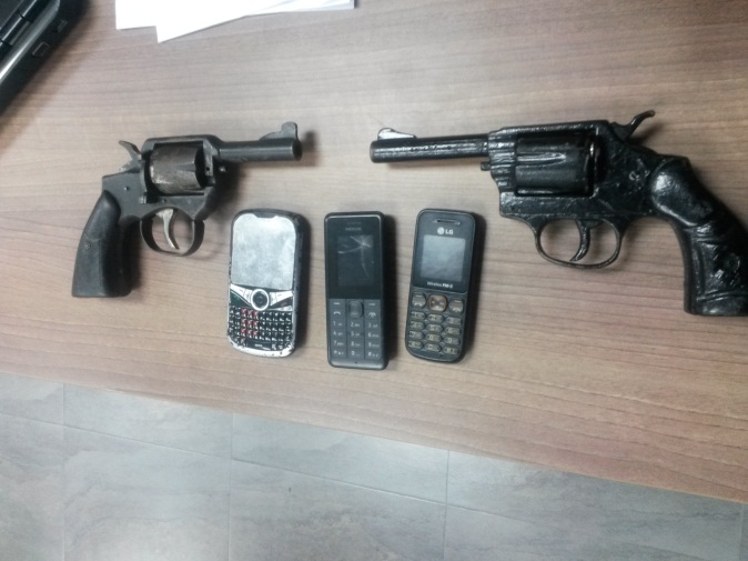 Como evidencias se encontraron un revolver calibre 38, marca Avela, con un cartucho, un revolver calibre 38, marca Konarma, con dos cartuchos, tarjetas bancarias de débito, celulares, dinero en efectivo, ropa y libros.