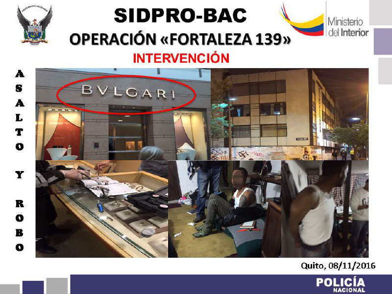 Luego, las labores de inteligencia indicaron que los extranjeros aprovecharon la salida de uno de los empleados al almuerzo, para luego ingresar con un catálogo de la marca Bvlgari, con la intención de comprar un reloj. Aprovecharon un descuido de la vendedora del local para someterla mediante la fuerza y maniatarla.