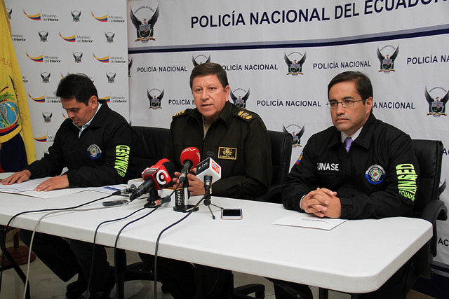 Esta tarde, en rueda de prensa, el general Ramiro Mantilla, jefe de Operaciones; el coronel Víctor Araus, director de la Dinased y el coronel Polivio Vinueza, jefe de la Unase, informaron que en 13 allanamientos realizados en las provincias de Pichincha y Cotopaxi se logró la detención de 11 ciudadanos, integrantes de una presunta organización delictiva, cuyo modus operandi era el robo de vehículos y maquinaria pesada. Posteriormente extorsionaban a los propietarios de dichos automotores.