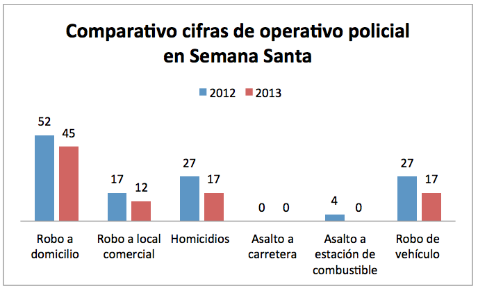 En cuanto a robo a personas, las cifras se mantienen. Durante el feriado de Semana Santa del 2012 se reportaron 48 casos y el 2013 registra un incremento mínimo a 50 casos.