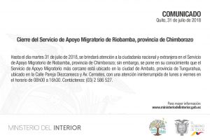 Servicios de Apoyo Migratorio cerrarán en el Puyo, Guaranda, Riobamba, Quevedo y Macas