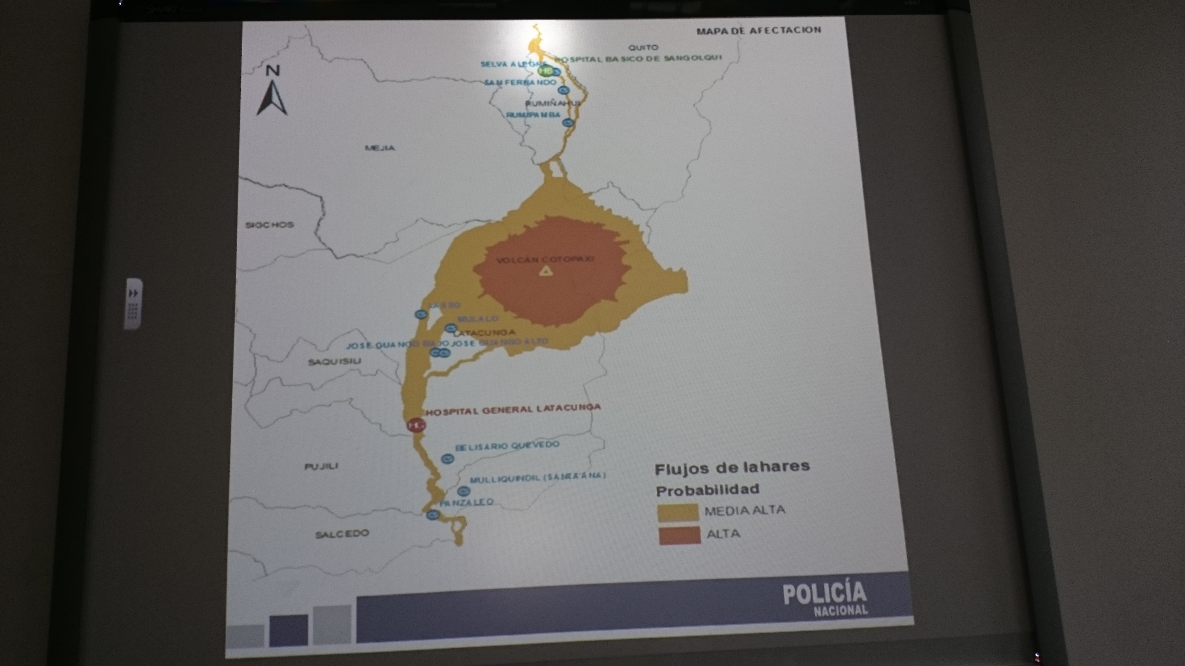Indicó que las provincias de Pichincha, Cotopaxi, Napo y Tungurahua son consideradas por el Instituto Geofísico de la zona Norte y Sur y la Secretaría de Gestión de Riesgos, como zonas de riesgo por la trayectoria que tomarían los lahares, que son flujos compuestos de material volcánico sueltos, mezclados y removilizados por el agua proveniente del lago cratérico que descienden rápidamente por los flancos del cono, siguiendo quebradas y los valles.
