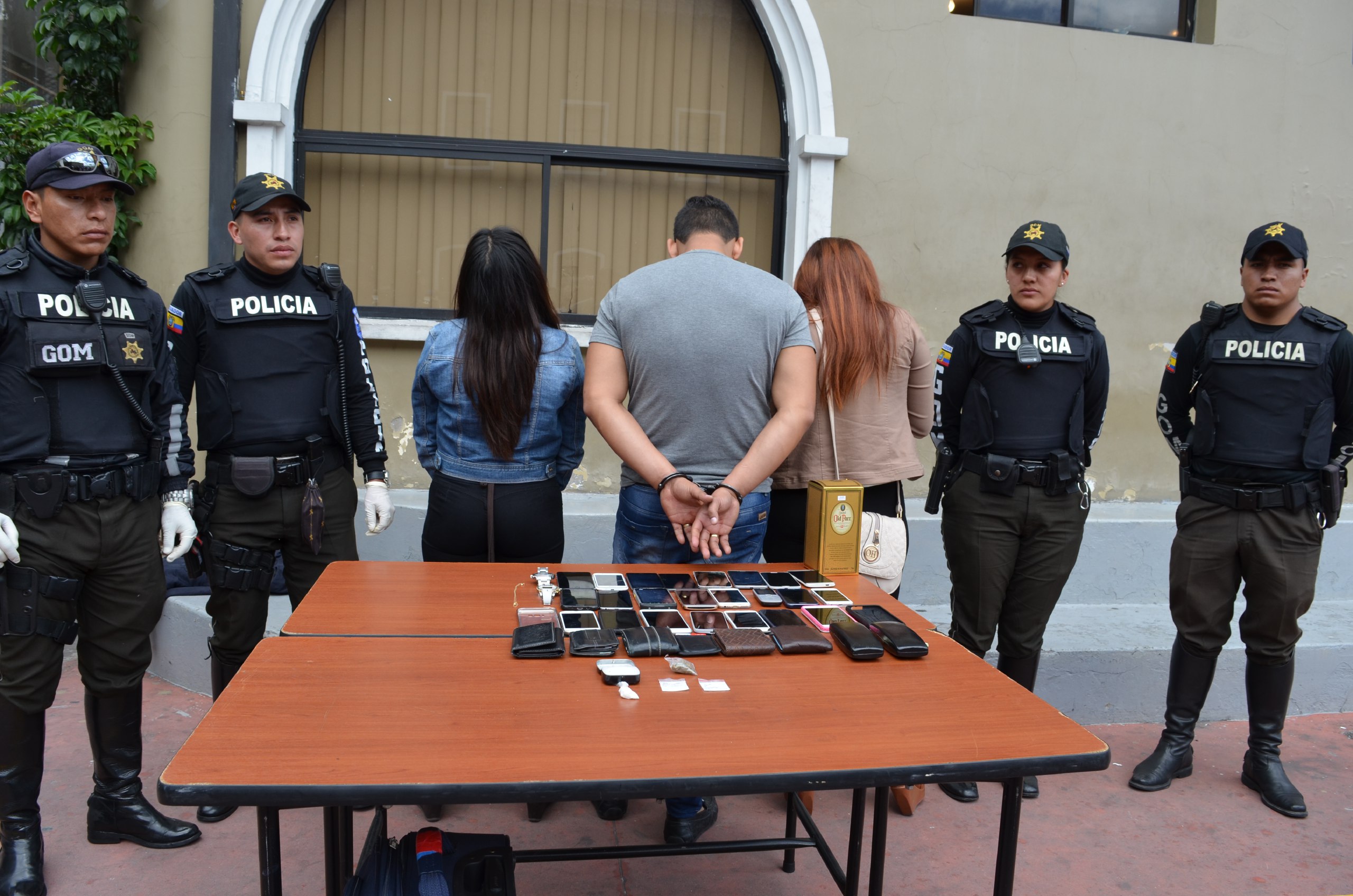 Los funcionarios policiales ingresaron al inmueble, con la debida autorización, y detuvieron a dos ciudadanos ecuatorianos y a una ciudadana colombiana. Entre las evidencias de hallaron 23 teléfonos celulares, 6 billeteras, 2 relojes, una cadena y pequeñas fundas de sustancias (escopolamina).
